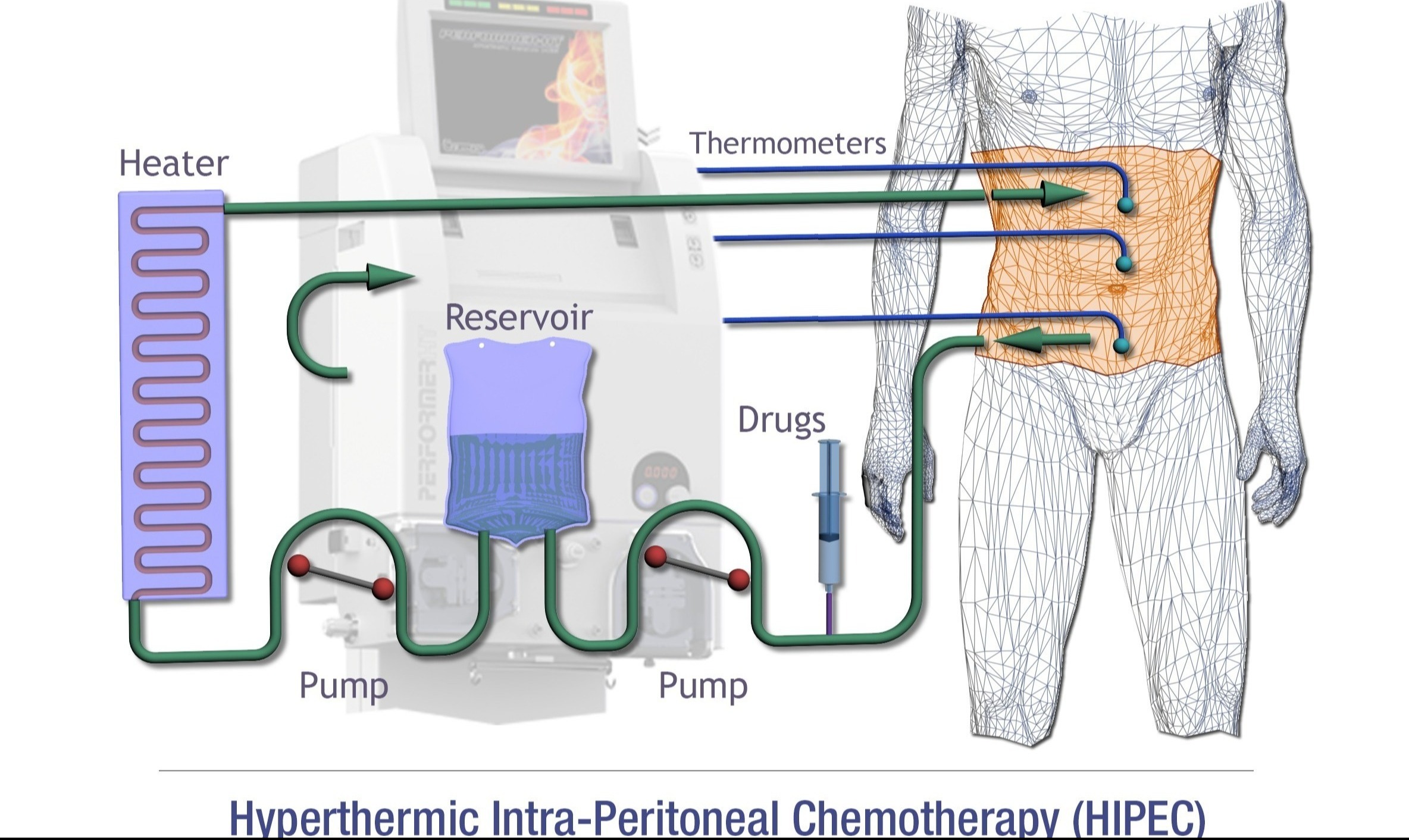 HIPEC (Hyperthermic Intraperitoneal Chemotherapy, targeted therapy, and immunotherapy ) is typically performed after tumor removal. The heated chemotherapy, targeted therapy, and immunotherapy are circulated in the abdominal cavity to destroy microscopic cancer cells. This method is particularly effective for treating ovarian cancer, pseudomyxoma, stomach cancer, and colon cancer.